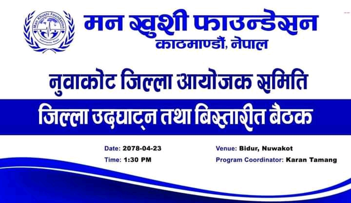 डिलबहादुर लामा-नुवाकोट। विशुद्ध समाज सेवाकाे उदेश्यका साथ लागिपरेको सामाजिक संस्था मन खुसी फाउन्डेसनले आफ्नाे शाखा विस्तार गर्ने भएको छ । आफ्नाे शाखा विस्तार गर्ने क्रममा नुवाकोट जिल्ला शाखा उदघाटन यही शनिबार २३ गते सुखद पाहुना घर सभाहल विदुर नुवाकोटमा गर्ने भएको छ । मुलुककाे सबै जिल्लामा विस्तार गरि समाज परिवर्तनकाे निमित्त काम गर्ने फाउन्डेसनले बताएको छ । नुवाकोट जिल्लाकाे नेतृत्वको निमित्त कलाकार करण तामाङ लगायतका युवा नेतृत्वहरुलाई अगाडि सार्ने तयारी रहेकाे फाउन्डेसनले जानकारी दिएका छन् । उदघाटन समारोहमा फाउन्डेसनका फाउण्डर प्रेजिडेन्ट मान बहादुर तामाङले सम्बाेधन गर्ने भएको छ ।